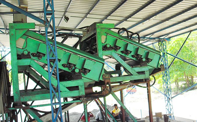 2、重選:黑鎢礦重選金鵬通常采用多級跳汰、多級搖床、中礦再磨的重選流程。細(xì)碎后合格礦經(jīng)過振動篩分級后進(jìn)行多級跳汰,產(chǎn)出跳汰重選毛砂,粗粒級跳汰尾礦進(jìn)入磨機(jī)再磨,細(xì)粒級跳汰尾砂經(jīng)過分級機(jī)后進(jìn)入多級搖床選別,產(chǎn)出搖床重選毛砂,搖床尾礦排入尾礦庫,搖床中礦返回再磨再選,跳汰和搖床的重選毛砂進(jìn)入精選作業(yè)。